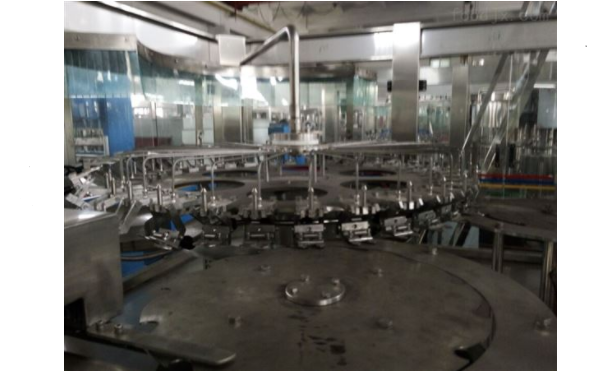 無菌水沖瓶瓶子進(jìn)入主機(jī)后通過傳輸星輪進(jìn)入沖瓶機(jī),瓶夾夾住瓶口沿沖瓶導(dǎo)軌向上翻轉(zhuǎn)180°,使瓶口向下。在沖瓶機(jī)特定區(qū)域(由分水盤決定——沖瓶水由沖瓶水泵泵入分水盤,后由分水盤通過24根管路分配至沖瓶夾),沖瓶夾噴嘴噴出無菌水,對(duì)瓶子內(nèi)壁進(jìn)行沖洗。瓶子經(jīng)沖洗、瀝干后在瓶夾夾持下沿導(dǎo)軌向下再翻轉(zhuǎn)180°,使瓶口向上。洗凈后的瓶子通過過渡鋼撥輪(純水沖瓶)從沖瓶機(jī)導(dǎo)出并傳送至下一工序-灌裝。